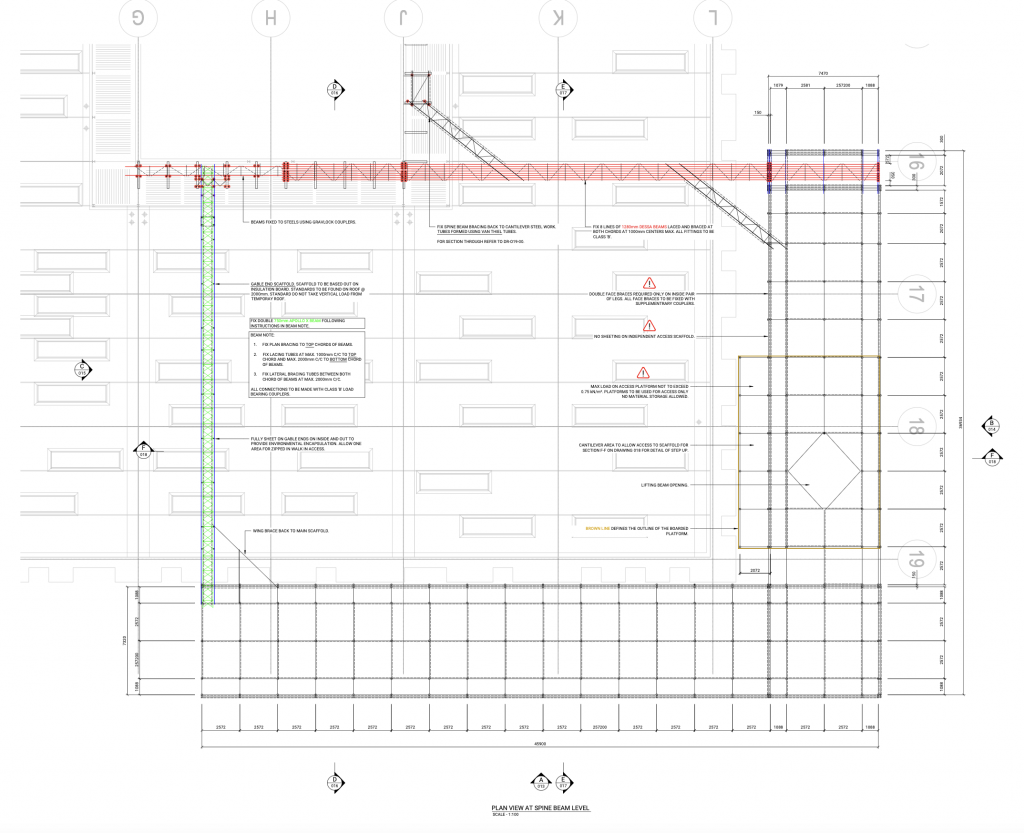 We was asked to provide a solution for a freestanding temporary roof with the ability the lift 2T using the scaffold roof beams.