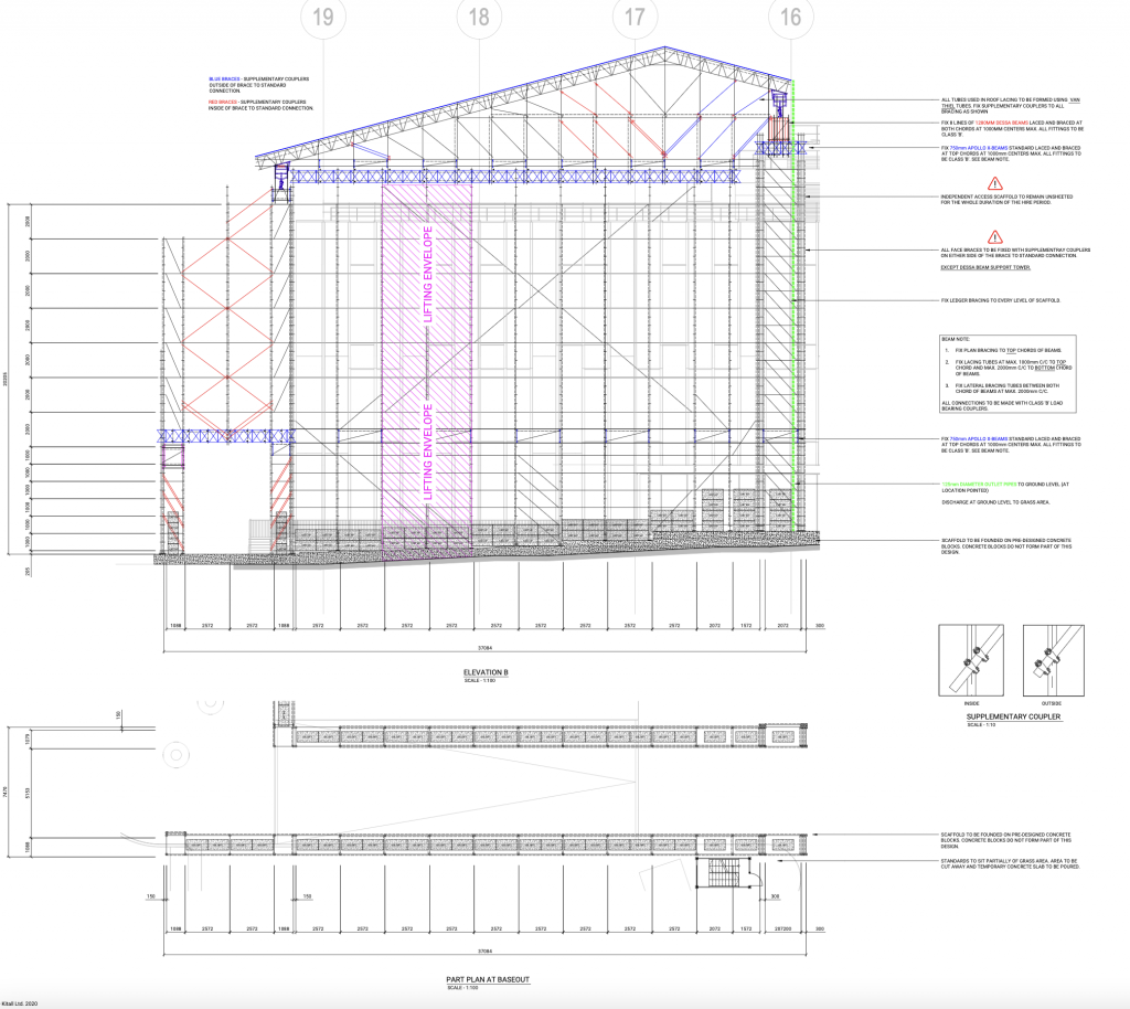 We created a temporary concrete base to support the scaffold during its erection, allowing it to freestand. To support the roof, we utilised the existing core and designed large spine beams, enabling the roof to roll.